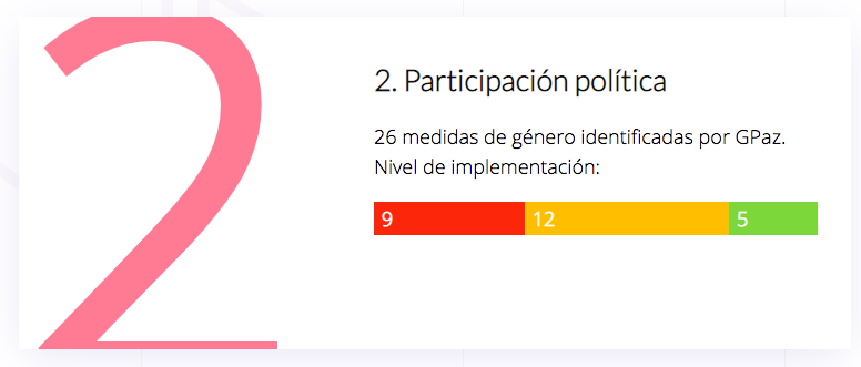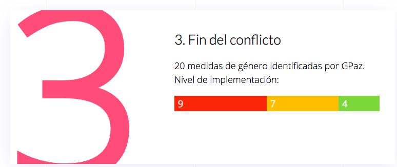 Varias voceras de Gpaz reiteraron que existe una desaceleración en el cumplimiento de las medidas de género en comparación con el gobierno anterior. Marcela Sánchez, directora de Colombia Diversa, destacó particularmente la falta de voluntad política para implementar la medidas que involucran a las personas LGBT, y explica que “eso se nota incluso en los conocimientos y la experiencias de los funcionarios encargados”.