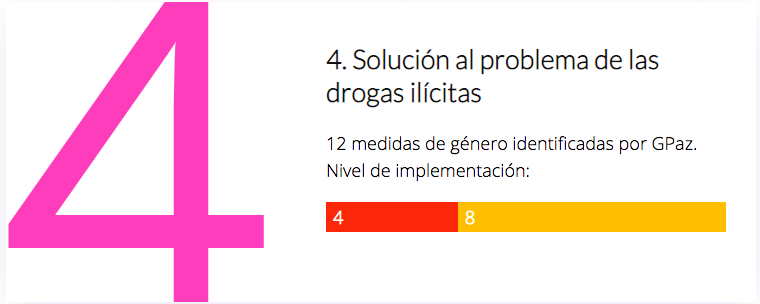 El punto de drogas ilícitas es el que menos avances presenta. Por un lado, la desfinanciación del programa de sustitución de cultivos y el incumplimiento del Gobierno en los pagos a quienes cultivaban coca han expuesto particularmente a las mujeres: “Muchas mujeres fueron quienes pusieron la cara y ahora están quedando como personas que comprometieron a la comunidad en un plan que no tiene continuidad”, explicó Luz Piedad Caicedo de Humanas.