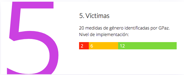 El informe revela que de las 122 medidas relacionadas con género en el Acuerdo de Paz, 13 ya fueron satisfechas, 19 presentaron avances satisfactorios, 50 tuvieron avances parciales y 40 no presentaron ningún avance entre agosto de 2018 y agosto de 2019.