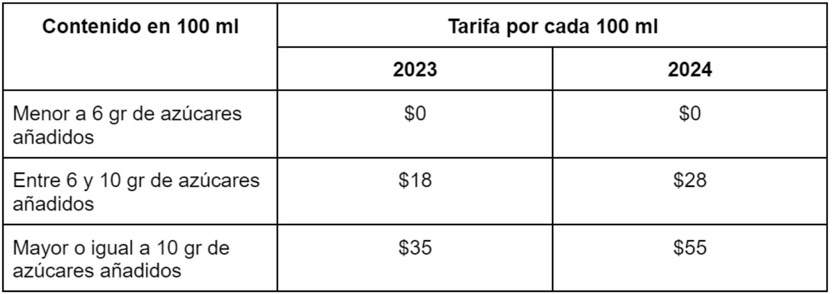 El Congreso de la República aprobó un impuesto que empezará a cobrarse en noviembre de 2023 y que se incrementará en los siguientes dos años. Su tasa depende del gramaje de azúcar de cada bebida. Así, las bebidas con menos de 6 gramos de azúcar por cada 100 mililitros tienen un impuesto cero; aquellas entre 6 y 10 gramos tendrán un aumento de $18 en 2023 y de $28 en 2024; y las bebidas con más de 10 gramos tendrán un impuesto de $35 en 2023 y de $55 en 2024.