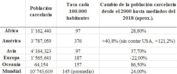 Tamaño, tasa y evolución de la población carcelaria por continente