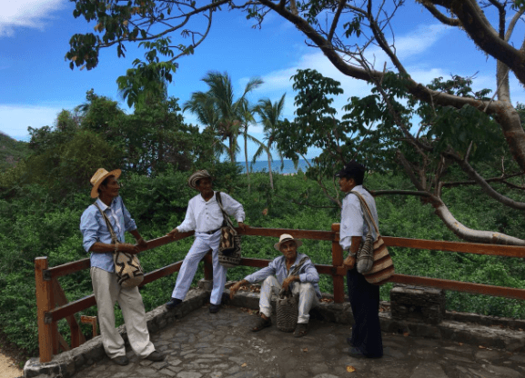 Foto de los Mamos, autoridades indígenas, en el Parque Tayrona terminando nuestro largo recorrido en las playas de la Costa Caribe. Los Mamos nos acompañaron durante todo el taller garantizando nuestro bienestar espiritual. Foto: Angélica Cuevas
