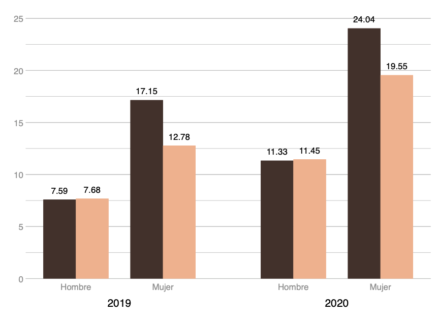 Por otra parte, y en cuanto al desempleo, la siguiente gráfica muestra la tasa de desempleo entre agosto y diciembre en el 2019 y el 2020 para la población afro y la población blanco/mestiza. La gráfica nos indica que para 2019 las mujeres afro presentaban mayor nivel de desempleo (17%) en comparación con las mujeres blanco/mestizas (13%) y que los hombres afro y mestizos (8% respectivamente). Aunque la crisis generada por el Covid-19 aumentó las tasas de desempleo para toda la población, este crecimiento no fue igualitario, pues tanto mujeres afro como mujeres que se auto reconocieron en la categoría de “ninguna de las anteriores” tuvieron un incremento de al menos 6 puntos porcentuales en la tasa de desempleo, presentando tasas del 24% y 19.6% respectivamente.