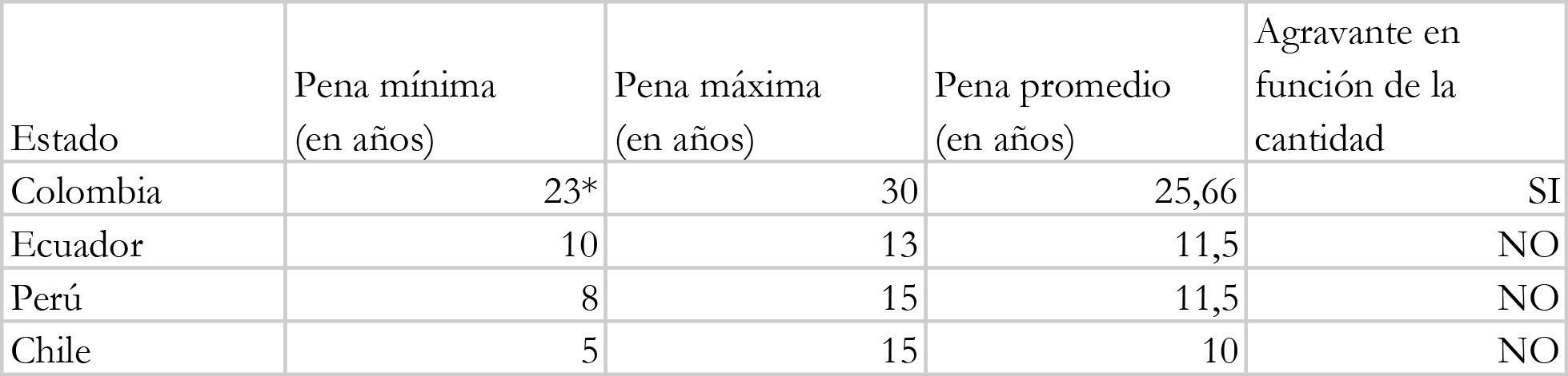Los anteriores gráficos demuestran que en la ruta del narcobus, las penas más altas se imponen en Colombia. De igual manera, es el único Estado que duplica la pena cuando la conducta supera cierta cantidad de estupefacientes con respecto al delito normal. Este aumento se realiza de manera diferenciada para cada sustancia sin ningún tipo de justificación y en la práctica permite que la agravante, supuestamente diseñada para castigar a las personas que traficaban con grandes cargamentos, le sea aplicada a personas que pretenden sacar del país en su esfera corporal cantidades medianas de cocaína o heroína.