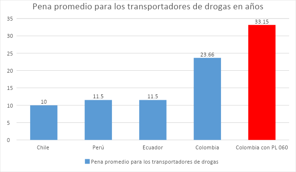 En el mismo sentido, por la naturaleza de la acción de transportar en vehículos de cargas, es sumamente probable que todos los transportadores de carga de drogas capturados en Colombia reciban una pena que en promedio puede llegar a ser de 24 años. Siempre y cuando no se apruebe un proyecto de ley de autoría de la Fiscalía, que aumenta la pena promedio a 33,15 años de prisión (barra roja en la gráfica). Una cantidad tan alta, que supera las máximas penas del homicidio simple y del acceso carnal violento para todos los países del Pacifico suramericano.