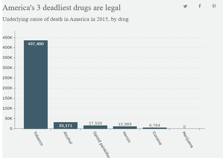 Su principal conclusión es que la droga más mortal, aun teniendo en cuenta los avances para limitar su publicidad y sus altos impuestos, es el tabaco. Así mismo, no se reporta ninguna muerte por el uso de la marihuana.
