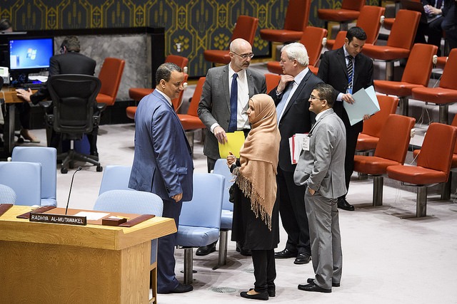 Radhya Al-Mutawakel, centro, representa la organización Mwatana para informar al Consejo de Seguridad de las Naciones Unidas sobre la situación de derechos humanos en Yemen. Fuente: United Nations Photo (CC BY-NC-ND 2.0), Flickr.