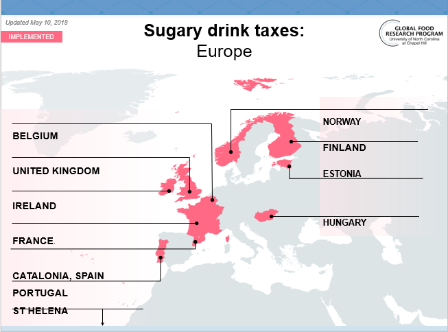 Sin embargo, en muchos países de las Américas los impuestos a las bebidas azucaradas se están convirtiendo en una tendencia. Siguiendo la experiencia de México y Chile que implementaron un impuesto en 2014, Berkeley, la Nación Navajo en Estados Unidos, Dominica y Barbados lo hicieron el año siguiente. A su vez, las ciudades de Oakland, Albany, Boulder y Filadelfia implementaron un impuesto en 2017. En 2018, lo hicieron San Francisco, Seattle y Perú.