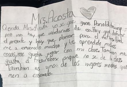 Quise hablar con ella para preguntarle qué pasó en su escuela luego de la elección del presidente republicano Donald Trump. Me contó que al otro día de las elecciones presidenciales «todos estábamos devastados». Afirma que personalmente le costaba mucho descifrar cómo les explicaría a sus niños la más reciente coyuntura ya que los días previos a la elección se sintió un fuerte ambiente de ansiedad. Cuenta que el 10 de noviembre fue un día muy difícil y que la primera reacción de sus estudiantes fue ponerse a llorar. Lloraban imaginándose que las duras e insólitas promesas de campaña de Trump, en contra de los latinos inmigrantes, se hicieran realidad; lloraban pensando en la posibilidad de ver a sus familias separadas.