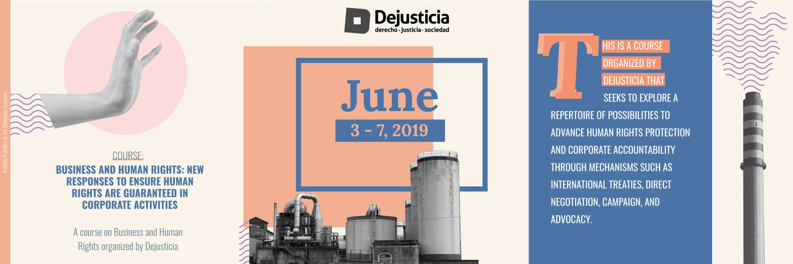This is a course organized by Dejusticia that seeks to explore a repertoire of possibilities to advance human rights protection and corporate accountability through mechanisms such as international treaties, direct negotiation, campaign, and advocacy. The course combines doctrine, practice, and strategies to implement human rights protections in the context of business activities. Participants from different sectors, including business, the academe, civil society, civil servants, and media are welcome.
