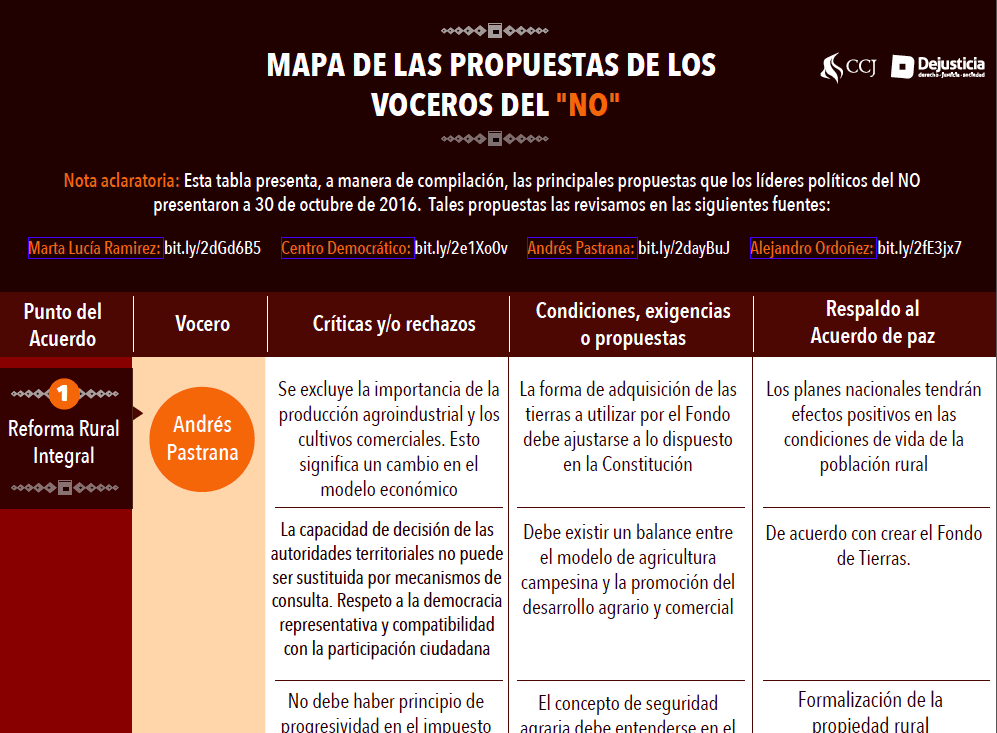 This table, elaborated by Dejusticia and the Colombian Commission of Jurists, compiles the main proposals of the political leaders of the NO.