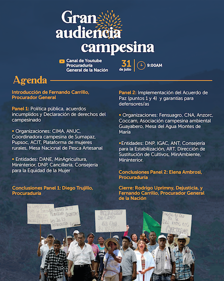 Como respuesta a la solicitud de más de 50 organizaciones campesinas, el procurador general de la Nación, Fernando Carrillo, convoca a una ‘Audiencia Nacional por la tierra, el territorio y el campesinado’ este 31 de julio a las 9AM vía Youtube.