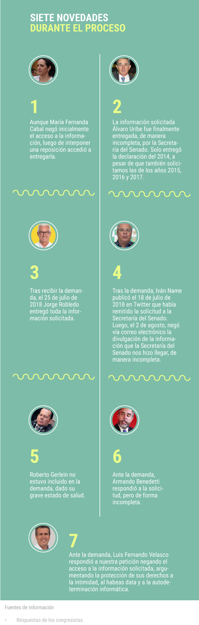 Nueve de ellos respondieron a nuestra petición, pero 11 no lo hicieron, negaron el acceso a la información o su divulgación argumentando la protección de sus derechos a la intimidad y a la seguridad personal, hicieron una entrega incompleta o en la práctica impidieron el acceso a los documentos. (Entérese quiénes en la infografía al final de este texto)