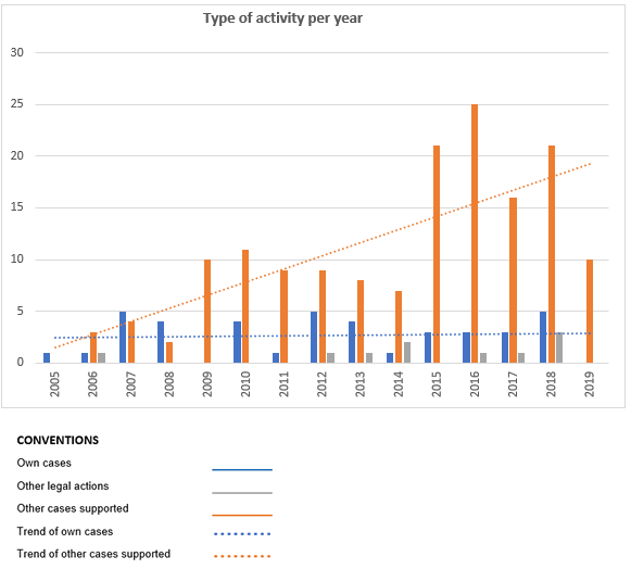 First, the database contains all the litigation that has been launched from 2005 to 2019. With the aid of 28 variables, one can observe a large part of the organization’s litigation history. This quantitative tool allows identifying successes and failures in the proceedings, the impact arguments have on court decisions, the trends of the volume of cases handled per year (For example: See Figure 1), the most litigated issues, among others. Apart from the quantitative perspective, the tool is also valuable for making more informed decisions about which litigation to pursue and how to pursue it.