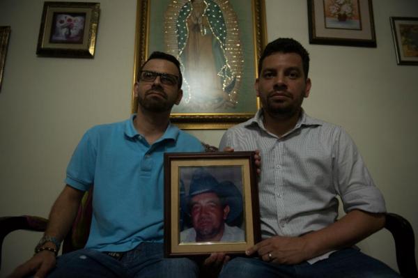 José Luis y Francisco Javier Contreras Lang posan con una foto de su padre, José Luis Contreras Ardila.