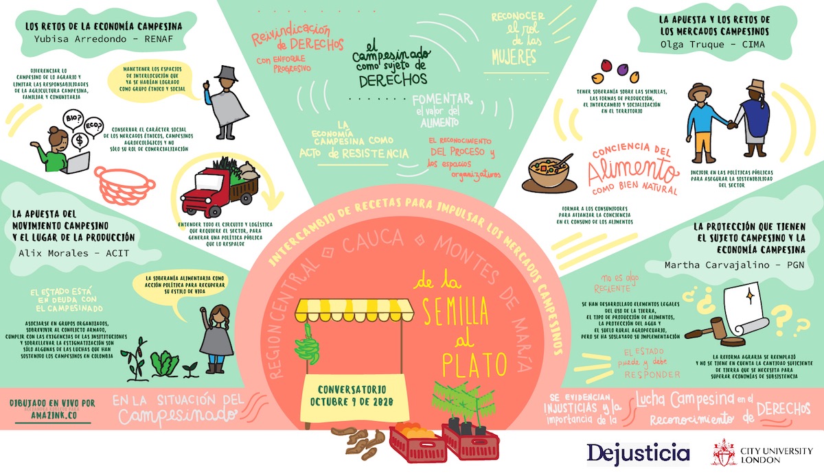 Para compartir propuestas de soluciones a estos retos, desde Dejusticia y el centro de política alimentaria de la Universidad de Londres convocamos al taller “De la semilla al plato: intercambio de recetas para impulsar los mercados campesinos”. Este espacio virtual reunió a diversos actores clave de los mercados campesinos desde tres regiones: Bogotá-región Central, Macizo caucano y Cartagena-Montes de María. Durante cuatro horas, organizadores de mercados, lideresas campesinas, consumidores, académicas, funcionarios locales y periodistas comunitarios alimentaron las recetas para fortalecer estas iniciativas.