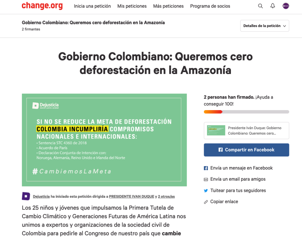 Invitamos a todos los niños, jóvenes y adultos de Colombia, Latinoamérica y el mundo para pedirle al Gobierno colombiano que cambie su meta de deforestación por una que enfrente la grave desaparición del bosque, de la que hoy somos testigos.Estamos perdiendo 219.973 hectáreas de bosque al año, y no podemos permitir que esta tasa se mantenga. Debemos presionar para que se reduzca para que cada año podamos acercarnos a nuestra meta de tener CERODEFORESTACIÓN en la Amazonía. Pidámosle al presidente que #CambielaMeta de reducción de deforestación del Plan Nacional de Desarrollo 2018-2022.